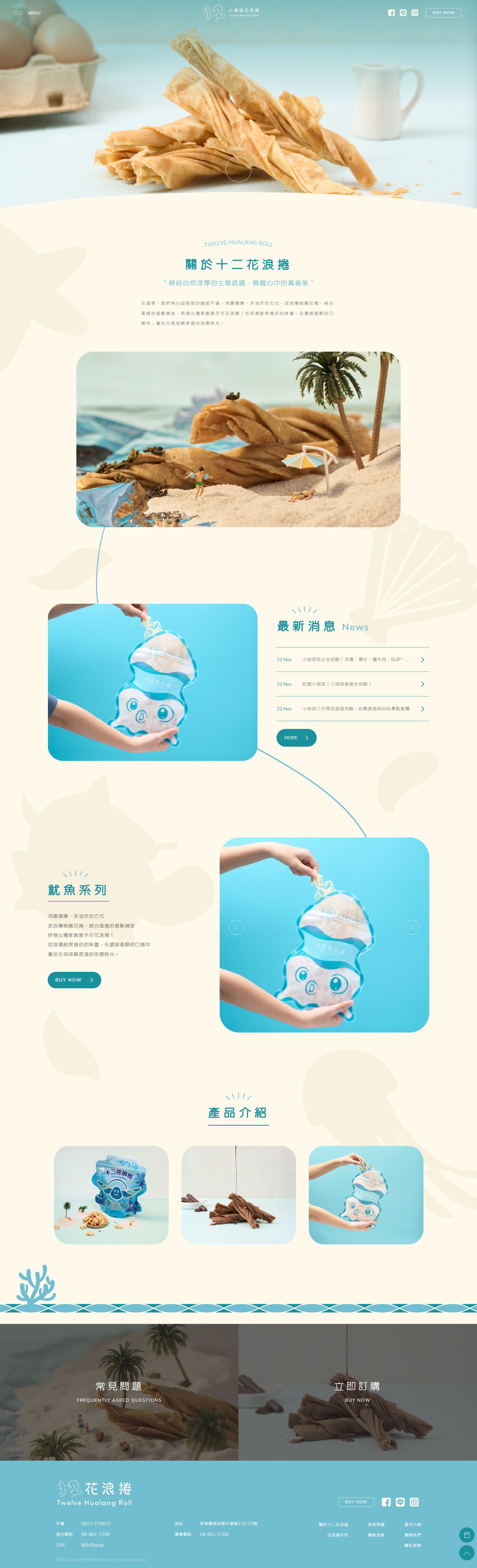 12小琉球花浪捲網站設計整體風格走 童趣 × 清新 × 海洋感 路線,塑造一種親切、療癒又具海島個性的品牌形象。以「小琉球+海浪捲點心」為主題,透過插畫元素、手寫感字體與擬真小模型搭景照,打造一個趣味又吸睛的品牌故事世界。