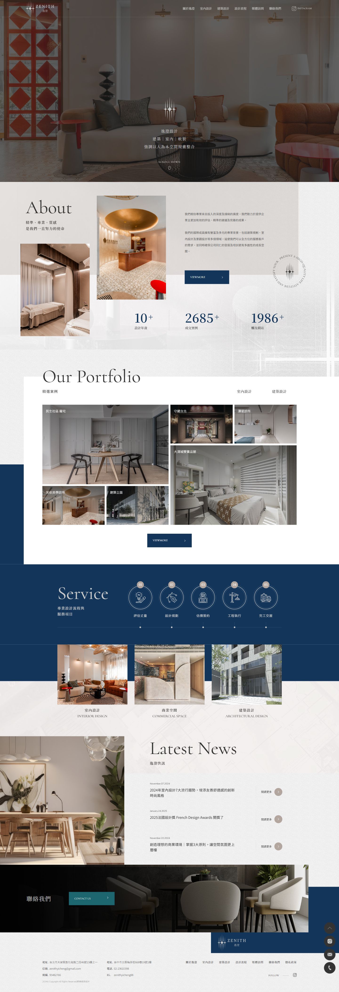 網站架構清晰,以橫向導覽列搭配首頁分段設計,從品牌介紹、作品集、服務流程到最新消息,皆有條不紊。Portfolio 區塊以圖片為主,搭配簡約文字,讓使用者能直觀瀏覽空間案例。每個區塊配置留白適度,資訊密度控制得宜,整體使用體驗輕鬆、流暢。